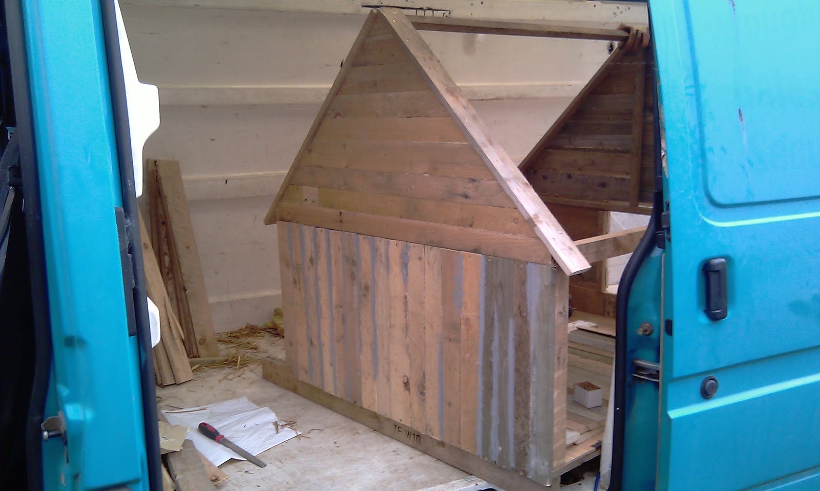 The pallets are put together like a tent. Two strips of timber are nailed to the bottom to determine width, then the top is simply screwed together.