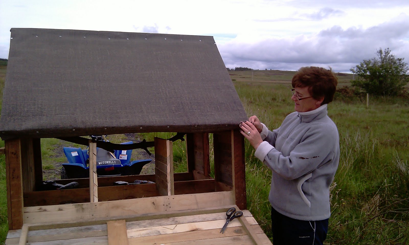 Egg laying boxes are in. Ann finishes the felt before the house is moved into the field.