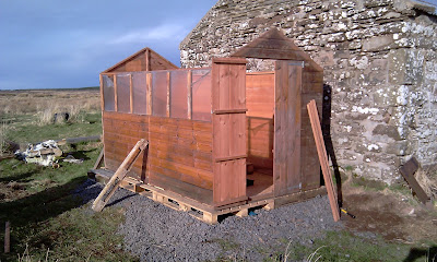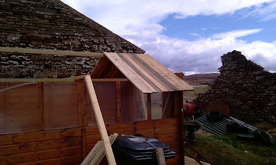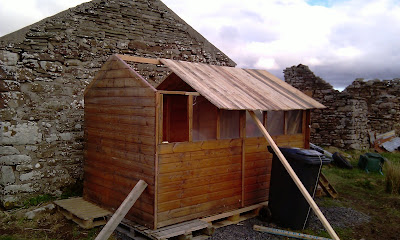 It's been a week since we put the shed walls up and the weather has been fine. Today it's windy again but we have decided to work on the shed anyway.