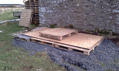 After a lot more raking and measuring the six pallets for the base are placed on the gravel and the floor of the shed is screwed into place.