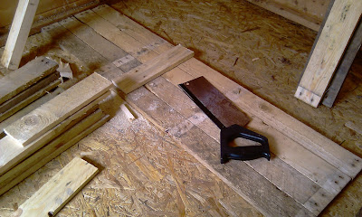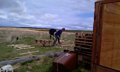 I am sure you can guess by now that we are taking pallets apart, yet again. Matt (helpX) and Ann (host) are "harvesting" the top and bottom timber for the roof panels.