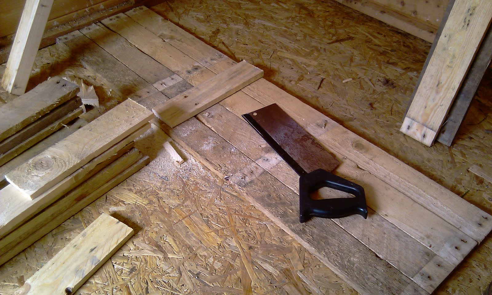 The pallet timber is cut to length and then screwed into place. The original roof panels got damaged and wet, so we decided on a pallet roof instead.