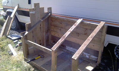 The base strips taken from underneath a pallet. The boards on top are cut to size and nailed onto the strips.