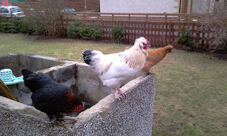 Here is a picture of our little trio in the garden of our rented house. They are on top of the old coal bunker as one of our dogs loves to play "tick" with them. They eventually get fed up and wait for the dogs to go inside before they carry on scratching around for bugs and worms. (left to right: Lucky, Stevie, Rona)