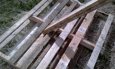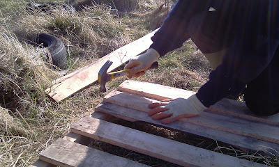 The project for this afternoon is building a composter. And guess what we are using to build with.... yes, pallets. So here we go again. Taking pallets apart.