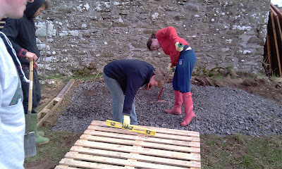 I am sure you can guess by now that we are taking pallets apart, yet again. Matt (helpX) and Ann (host) are "harvesting" the top and bottom timber for the roof panels.
