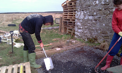 Chris (family) is bringing gravel with a trailer and quad from the front of the drive, whenever he manages to draw his attention away from his sweaty feet.