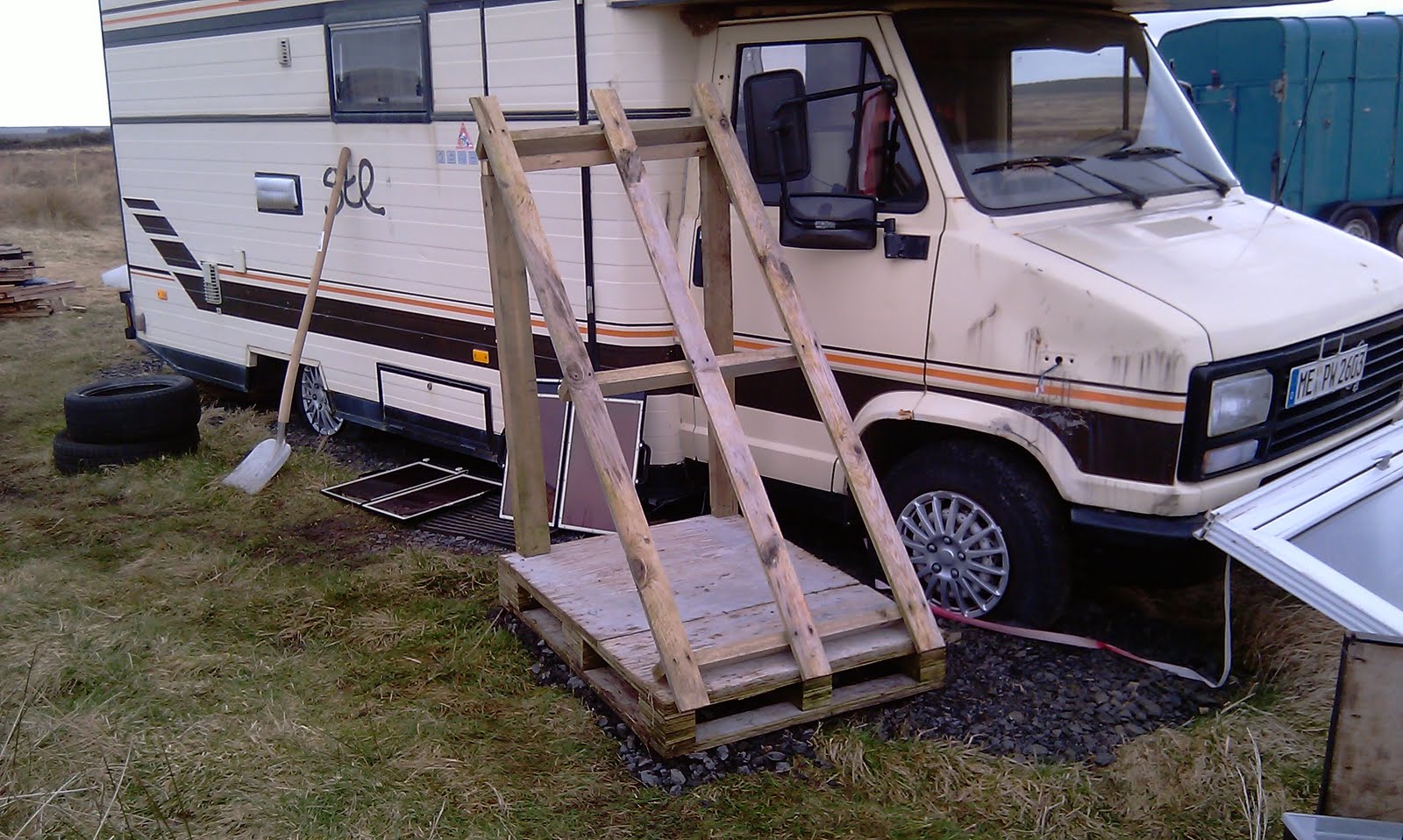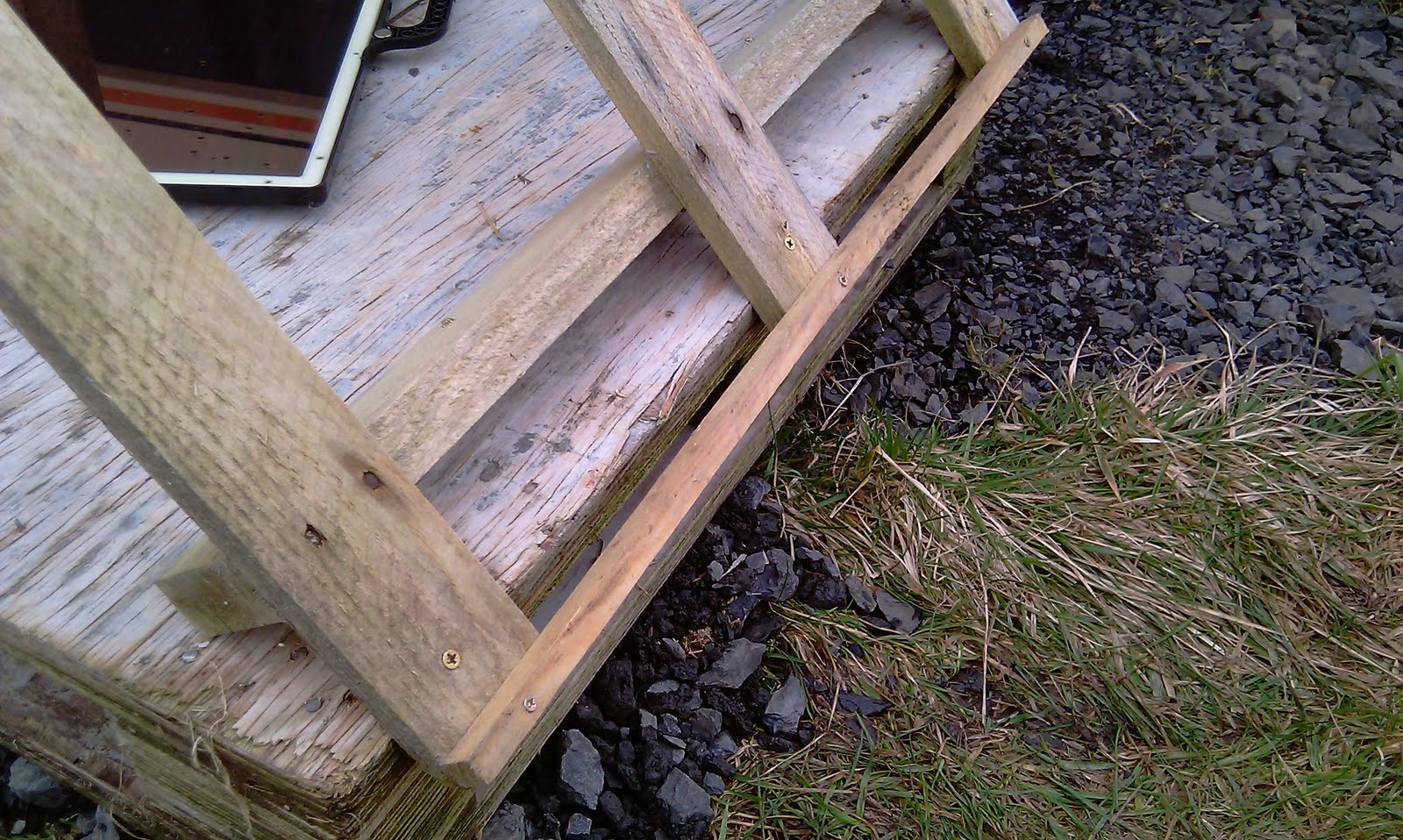 Some old posts cut to length, screwed to the base, and the back of the frame is done already. The damage on Nessie you can see in the picture is from last years 112 mph storm. It lifted a large 150wp solar panel off the ground although it was tied to the bumper. The glass shattered on the panel but it still works. I plan to repair it one day. Poor Nessie got bruised and battered.