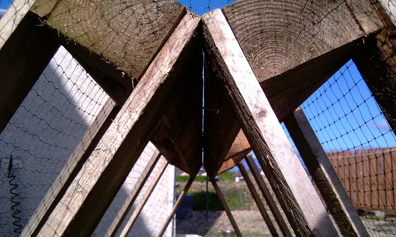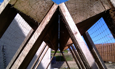 The pallets are put together like a tent. Two strips of timber are nailed to the bottom to determine width, then the top is simply screwed together.